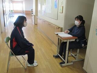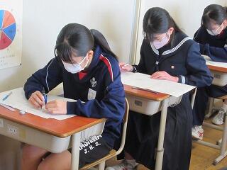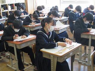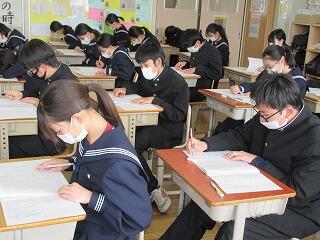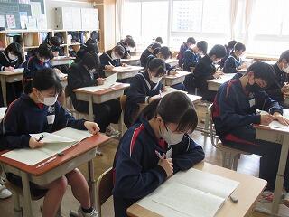 1,2年生は定期テスト2日目です。今日は,数学,英語,理科です。これで今年度の定期テストはすべて終了になります。3年生は2週間前に既に終えていて,来週の公立高校入試の面接や学力検査に向けて最終確認をしているところです。先生に相談したり,自分の考えをまとめたり,過去問を解いたりしています。