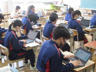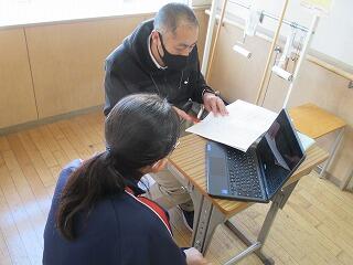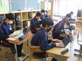 音楽の授業では,「文楽」(語り手の太夫と三味線弾き,そして人形遣いの三者が一体となって表現する舞台芸術で,江戸時代から続く日本を代表する伝統芸能の1つ)について,映像を視聴しながら学習していました。美術では,端末を使って都道府県の特徴を調べて,ゆるキャラのデザインを考案していました。体育では,ハンドボールとバドミントンに取り組んでいて,だいぶ上達してきました。