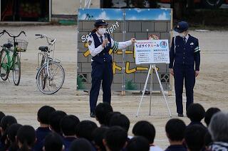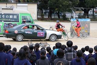 「スケアード・ストレイト」とは,「恐怖を直視させる」という意味で,スタントマンが目の前で交通事故を再現することにより,交通事故の衝撃や怖さを実感し,交通ルールを守る大切さについて考える機会とするものです。柏警察署交通課の方から,自転車の安全な乗り方について講話をいただき,その後,実際に起きた交通事故の模様や事故につながる危険な行為などについて実演を交えて教えていただきました。