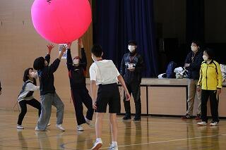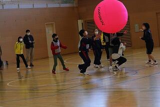 12/10に,青少協主催の「ふれあい広場」を開催しました。午前中は,体育館で“キンボール”というニュースポーツを行いました。小学生,中学生,大人がそれぞれチームをつくり,9チームでゲームを行いました。ほとんどの参加者が初めての体験でしたが,簡単なルールなのですぐに要領を得て,ゲームを楽しむことができました。午後は,おなじみの“逃走中”をグラウンドで行いました。大人と中学生がハンターとなり,逃げる小学生を追いかけました。世代を超えた交流で心地よい運動になりました。