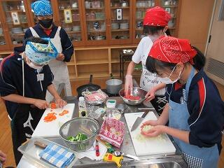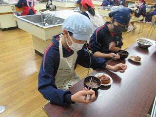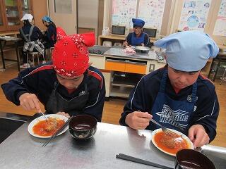 1年生の家庭では,調理実習を行いました。煮込みハンバーグと野菜スープをつくりました。涙をこらえて玉ねぎを刻み,おいしくなーれと願いながらひき肉をこねて,力を合わせて見事な食事が完成しました。
