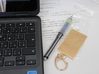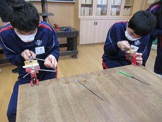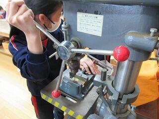 2年生の技術は,新しい教材への取組が始まりました。真鍮板を加工してキーホルダーをつくっていきます。考えたデザインにするために,工具や機械を使って,切ったり削ったりしていきます。