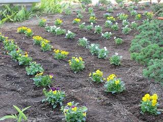 PTAの除草作業で草やぶが刈り払われた空中庭園に,地域ボランティア「ゆいの会」のみんさんに集まっていただき,色とりどりのビオラを植えました。感謝!感謝!!です。空中庭園の2階部分に植えましたので,これから廊下や2組前のコモンスペースからきれいな景色が見られることでしょう。