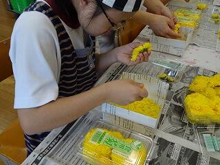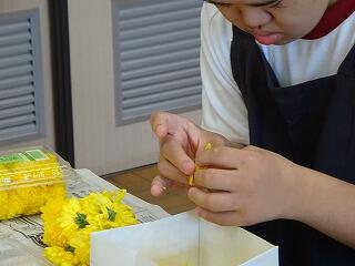 10月15日(火)は「十三夜」でした。十三夜は「収穫に感謝すること」が目的の一つのため,旬の食べ物をお供えし,栗名月・豆名月とも呼ばれています。菊花ちらし寿司に入れる菊の花をやまびこクラスの皆さんがほぐしてくれました。