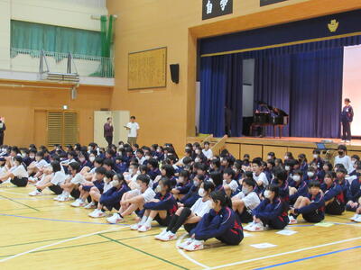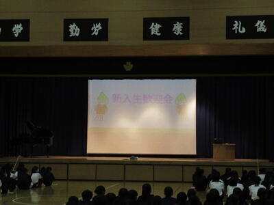 学年集会では、先生方の自己紹介と栄養士の神戸先生から、来週から始まる給食についてお話がありました。小学校に比べて量や品数が増えることや、栄養バランスよく食べることの大切さなど、丁寧に教えていただきました。