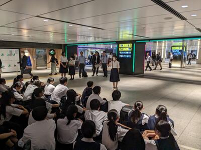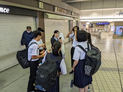 全班無事に東京駅新幹線団体集合場所に到着し、出発式を行っています。実行委員長からは、「このあとの行程が実りあるものになるように」と話がありました。このあと新幹線に乗車後、朝の軽食タイムとなります。