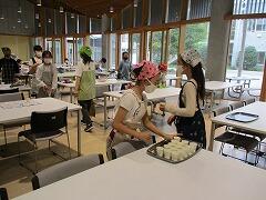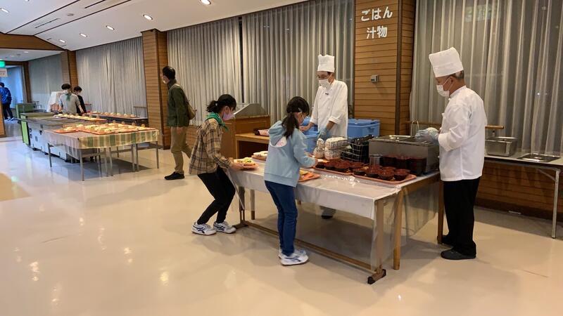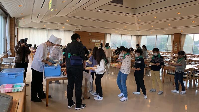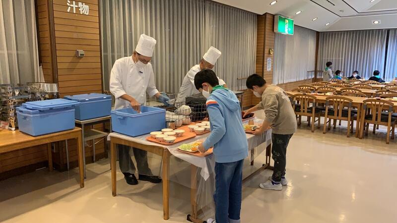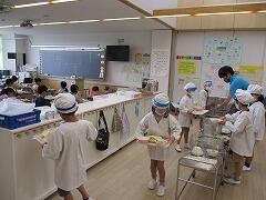 (給食の盛り付けは,「給食室」からご覧になれます。)