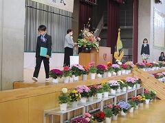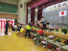 体育館の清掃を行い,いすを並べて,鉢花を飾っていきます。