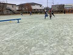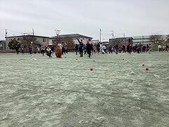 校庭に置かれた4つのカゴと先生が背負ったカゴをめがけて、たくさんの玉を投げ入れていました。