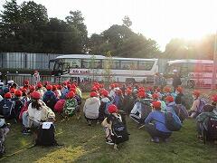保護者や職員が見守る中,予定通りにバスで手賀の丘少年自然の家に向かいます。