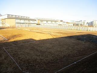仮囲いの中では重機がフル稼働して更地にして,新校舎の位置が決められています。
