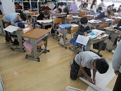 背筋を伸ばして字を書いているのは1年生です。B4サイズの大きな用紙に,順序だてて文章を書いています。