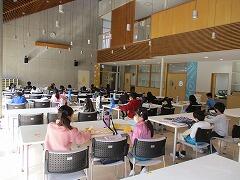 待っている時間は,多目的ホールで漢字練習や計算ドリルなどを行います。