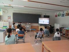 児童会役員のアナウンスに合わせて,教室で動画を見ます。