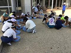 草を抜き終えた後,「洗剤なしで洗濯」「液体洗剤で洗濯」「粉末洗剤で洗濯」の3グループに分かれて,泥で汚れた軍手を手洗いしました。
