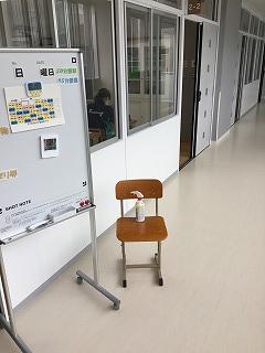 廊下には消毒液が置いてあります。 すぐに体温を測れるようにしています。