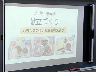 1学年の家庭科の学習活動では、学校栄養士の先生とコラボレーションし献立作りを行っています。
