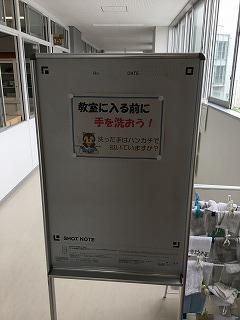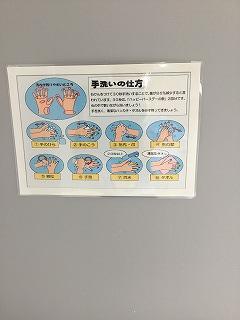 教室に入る前に手を洗います。        水道の前には手洗いの仕方が掲示してあります。