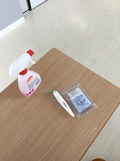廊下には消毒液が置いてあります。         すぐに体温を測れるようにしています。