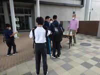 生徒たちは正門前で健康観察、消毒を行います。