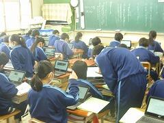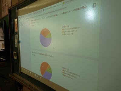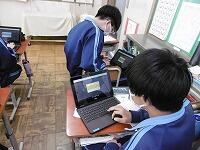 それぞれのクラス代表がアンケート結果を元に3学期の反省や2年生への抱負について話しています。またクラスでは各自chromebookで資料を見ながら、話を聞いていました。
