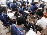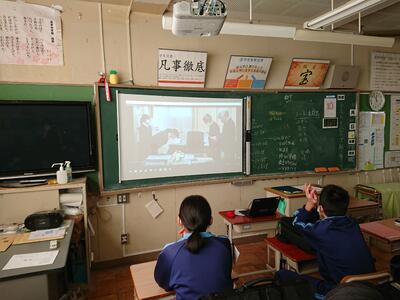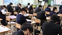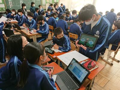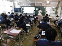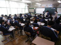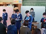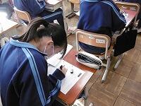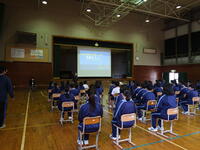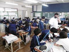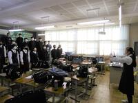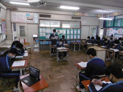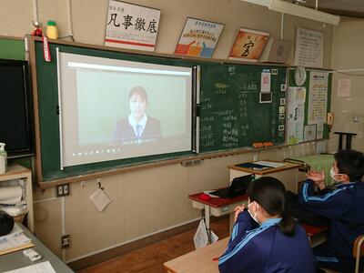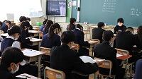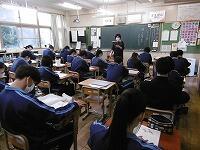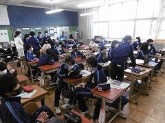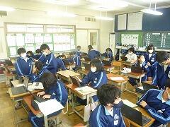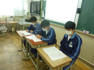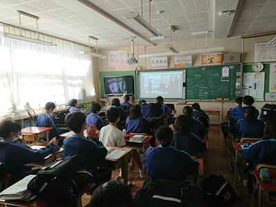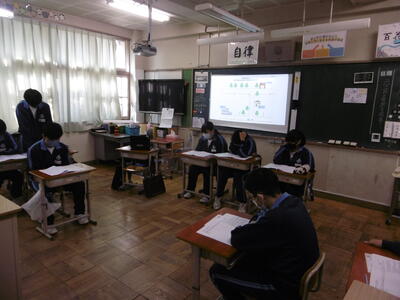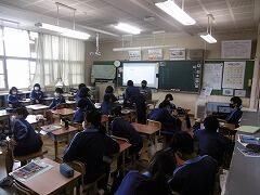 校長先生・生徒会役員も第一理科室で視聴しました。2年1組の様子