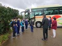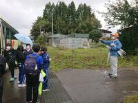 各クラスのグループにわかれ、農村体験の開校式を行う予定でしたが、やはり山の天気は変わりやすいようで、また雨が降ってきました。バス内にて農村体験の注意点を確認し、農家の方々に挨拶をして、これから活動場所に向かいます。