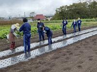 こちらは岩月方面です。みんな笑顔で活動しています。慣れない畑に足をとられながら、野菜の苗植えを行っています。雨もパラパラと降ったりやんだりなので、雨具を着ての作業です。