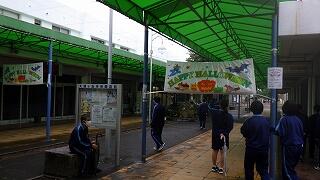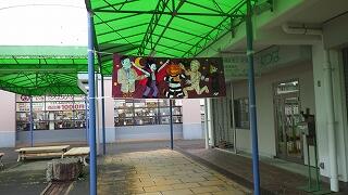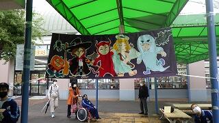 本日、カルチャー部の1・2年生は、大津ヶ丘の商店街より夏休み前に依頼されて制作した『ハッピーハロウィンの横断幕』が、ランドローム・フードコートで行われているハロウィンの催しに展示されているため、顧問の先生方の引率で、連れ立って見学に行きました。ぐずり気味の天候の中でしたが、徒歩で向かいました。この催しの関係者の方にもお会いすることができました。