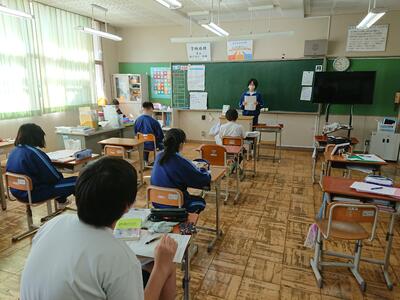 本日6時間目は、旧林間学校レク班による、レクリェーションが行なわれました。レクリェーション班が考え、昨年秋に、まん延防止状態のために隣席との間隔を開け、1クラス2台体制での行き帰りのバス内で行うはずだった種目のいくつかを、各教室で行ないました。イントロ当てクイズ、物の名前文字のシャッフルゲーム、イラストでの伝言ゲームなどが行われました。