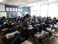教室では、林間学校のしおりや、震災学習で使った「学習の手引き」を見返しながら、黙々と原稿を書いています。