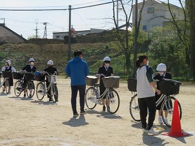 本日,1年生の自転車通学希望者に筆記テストと実技テストを実施しました。実技テストは,校庭に各自の自転車を運び,自転車点検でベルやライト等の確認を受けてから実技テストコースを走行しました。みんな無事に合格できたでしょうか。明日からも安全運転で登下校を心がけましょう。