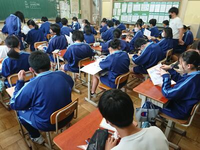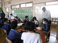 途中、今年度新しく風早中に来たALTのエマ先生が教室を回り、生徒達と英語で会話をする場面もありました。