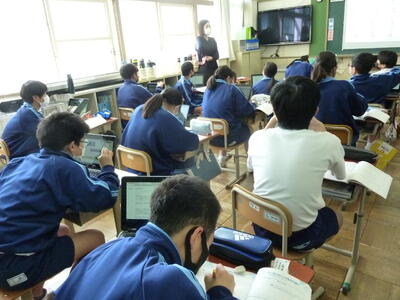 4時間目には生徒会や3年生の先輩方による学校紹介をリモートで視聴しました。委員会活動や部活動について確認することができました。