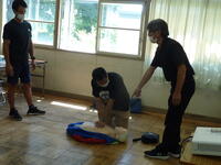 養護教諭より、応急手当の手順や胸骨圧迫、AEDの使い方についての説明があり、実施に人形を使った練習を行いました。