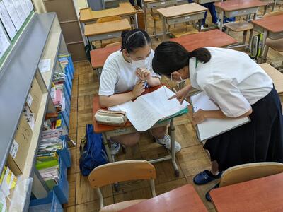 3学年は、8月25日、26日、29日の3日間、学習会を実施しました。本日29日は我孫子高等学校の教員基礎コースに所属する2名の高校生が、風早中学校の3年生のために、夏休み学習支援として来てくださいました。