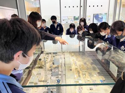 いわき震災伝承みらい館に到着し、館内見学と、バスで市内を回りながら語り部さんにお話をしていただくのとをローテーションしながら震災学習を行いました。