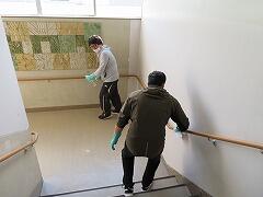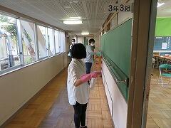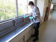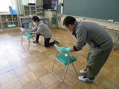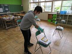 7・8日の登校日へ向けて、本日は教室内の整備のほか、校舎内の手を触れる場所の消毒を行いました。