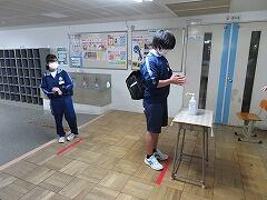 *9時から生徒たちが登校。登校したらまず手指の消毒を行います。