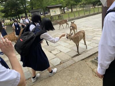 奈良公園では、たくさんの鹿がおやつを貰ったり散歩をしたりと自由に過ごしていました。鹿せんべいをあげたり、写真を撮ったりと鹿との触れ合いに生徒たちも盛り上がっていました。