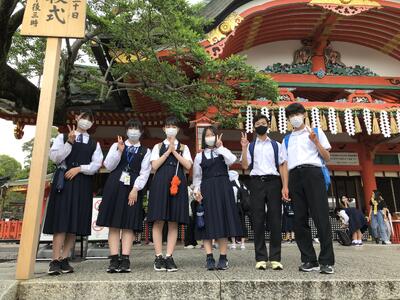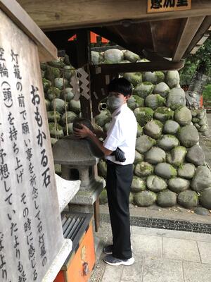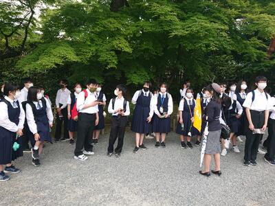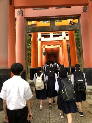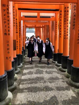 1時間程度の時間ではありますが、1組は伏見稲荷大社での班別行動です。雨が多少ぱらついていましたが、生徒たちは見所いっぱいの稲荷大社を堪能していました。朱塗りの鳥居が連なる千本鳥居を見てどの生徒も圧倒されてました。