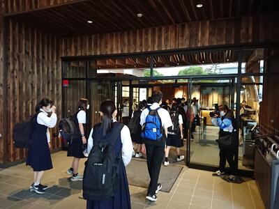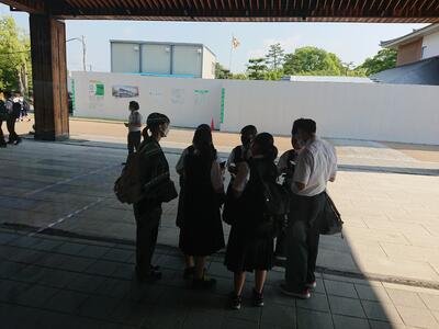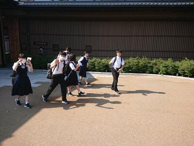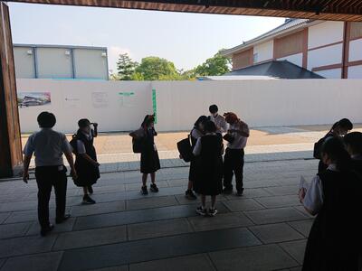 2、3組は平等院鳳凰堂に到着しました。10円玉でも知られている平等院。平等院を背景に写真を撮る姿が目立ちました。平等院の敷地内にあるミュージアムを見学し、班別行動を行っています。