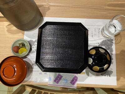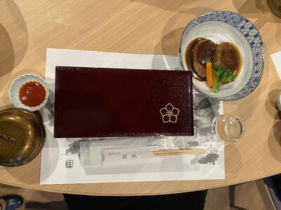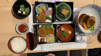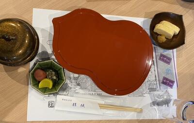 本堂前での写真撮影を終え、朝食を食べています。お弁当箱に入っている朝食は、彩り豊かな日本食でした。