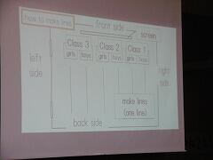 体育館に入ると、並び方の指示が英語で表示されていました。