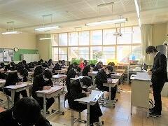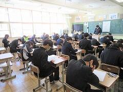 写真をよく見ると、上着(コートやウインドブレーカー)を着ている生徒がいますね。というのも、今年度の入試では、教室内換気を行うため、試験中に上着の着用が可能となりました。それに合わせて、実践です。
