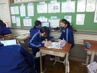 3年間の社会の授業で学んできたことを総動員し、現在・未来・社会・個人の4つの視点から考えてもらいましたが、どのクラスもしっかりと書けていました。身近なものとしてフードロスへの取り組みやエコバックの利用、将来はバイトで稼いだお金を募金するなどというのもありました。ぜひ宣言だけで終わらせず、意識を持ち、将来に向けて社会貢献をしていってほしいと思います。