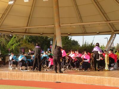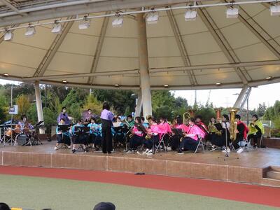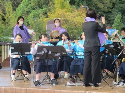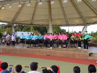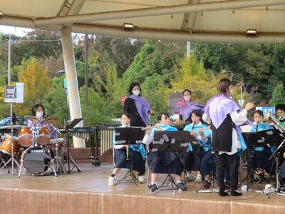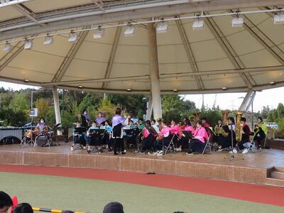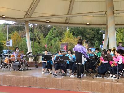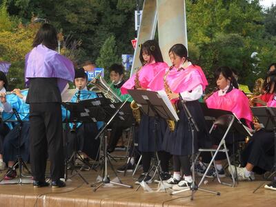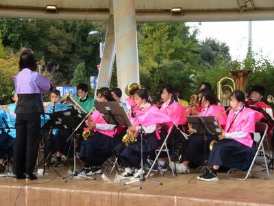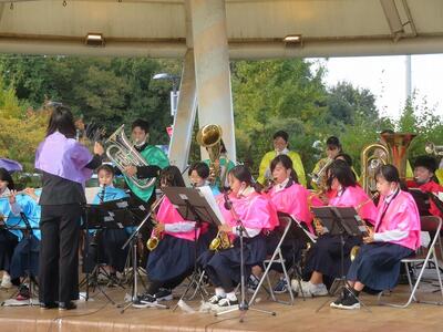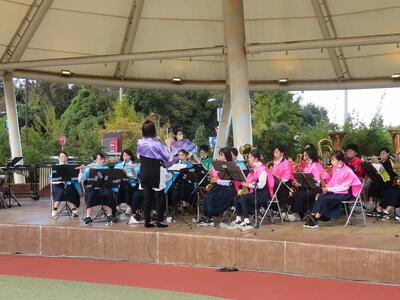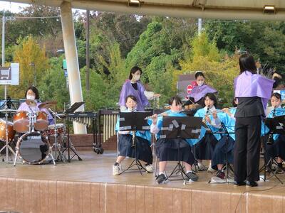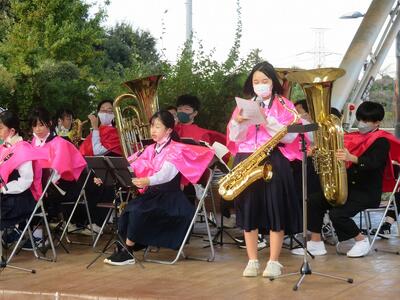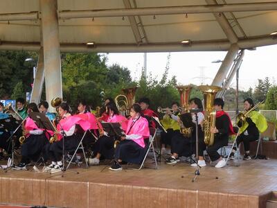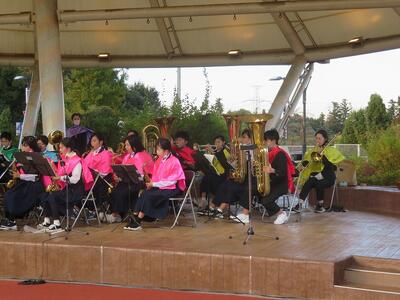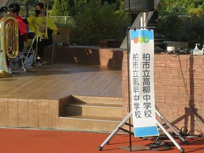 3日(木)文化の日にアリオ柏で開催された「第4回アリオ柏文化祭」に本校吹奏楽部が高柳中学校と合同で出演しました。この催しは,市内中高生の吹奏楽やダンス,演劇,書道などのステージ・パフォーマンスを披露するものです。市内中学・高校を中心に14校が参加しました。会場が屋外のスマイル・パークステージということもあって発表時に風が強く,譜面台が安定せず大変でしたが頑張って4曲を披露しました。