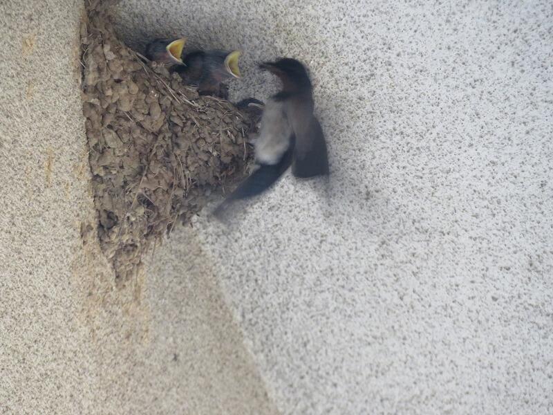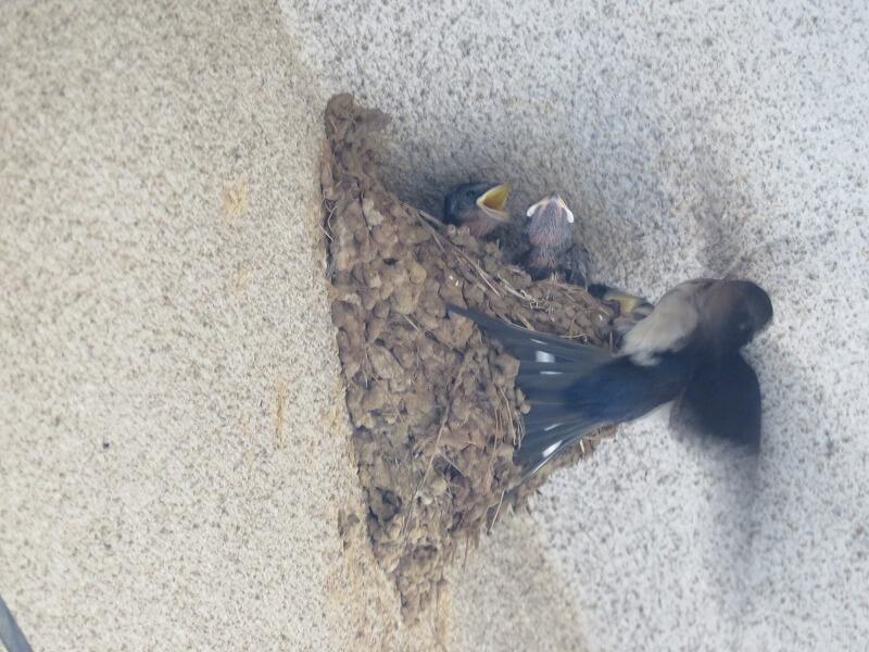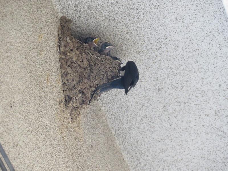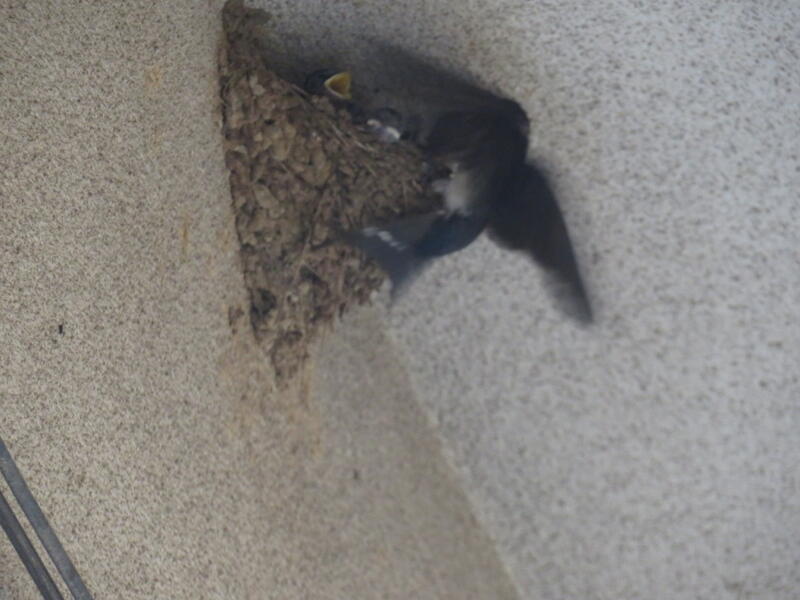 そして,もう一か所,生徒昇降口の通路の屋根にもつばめの巣が一つあります。毎朝,生徒全員が通る場所ですが,騒がしさを気にせず卵から無事にひながかえりました。今,子育ての真っ最中です。