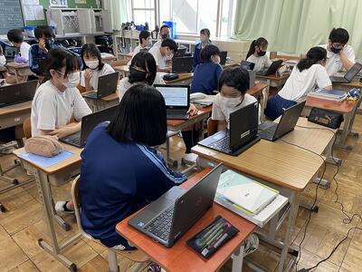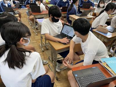 授業では、一人一台端末を活用して、課題に見合った図やデータを集めたりChromebookのスライド機能を利用したりと、プレゼンテーションに向けた準備を積極的に行う姿が印象的でした。