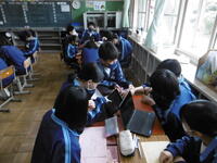 学活で教科書の配布、係や委員会決め、掲示物の準備等を行いつつ、2,3年生合同で入学式の練習を行いました。